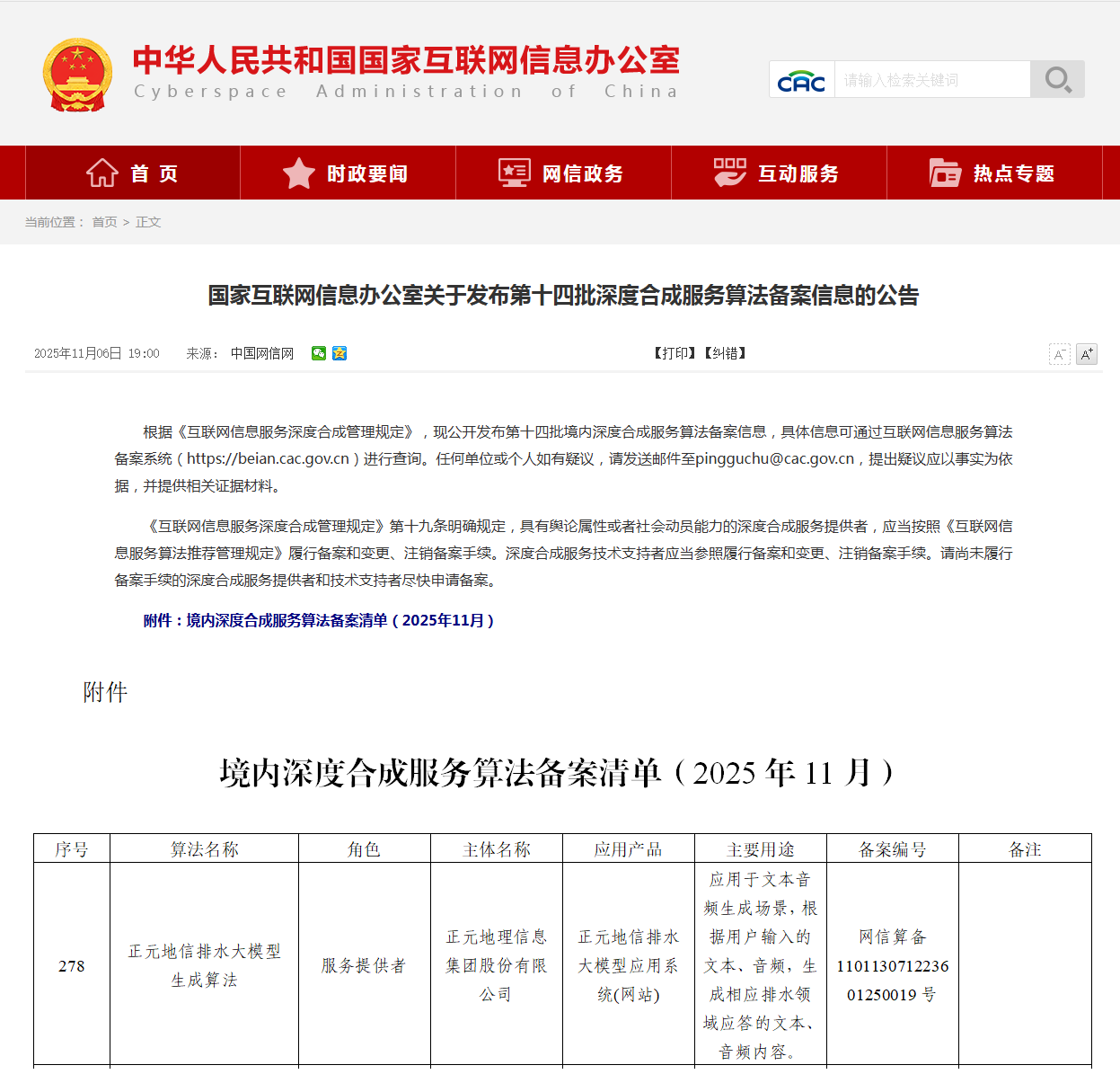 “正元地信排水大模型生成算法”获国家网信办备案 2025-11-13